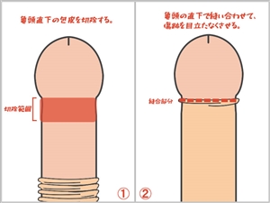 包皮を剥いて亀頭を露出し、治療用の糸を使ってペニスの根本を固定する方法です。